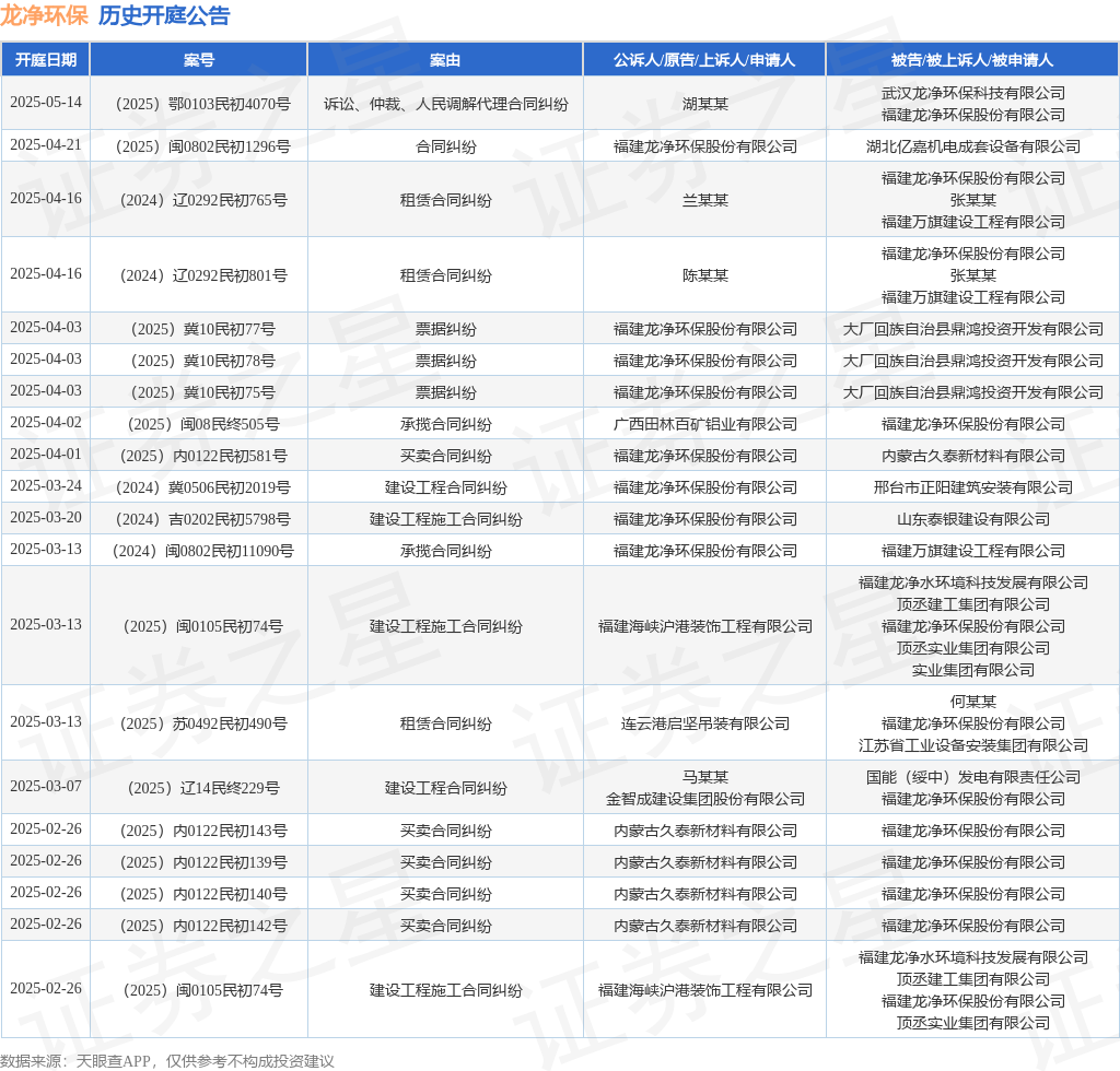 证券之星消息,根据天眼查APP显示,近日公布了一则福建龙净环保股份有限公司作为原告/上诉人的开庭公告,详细内容如下: