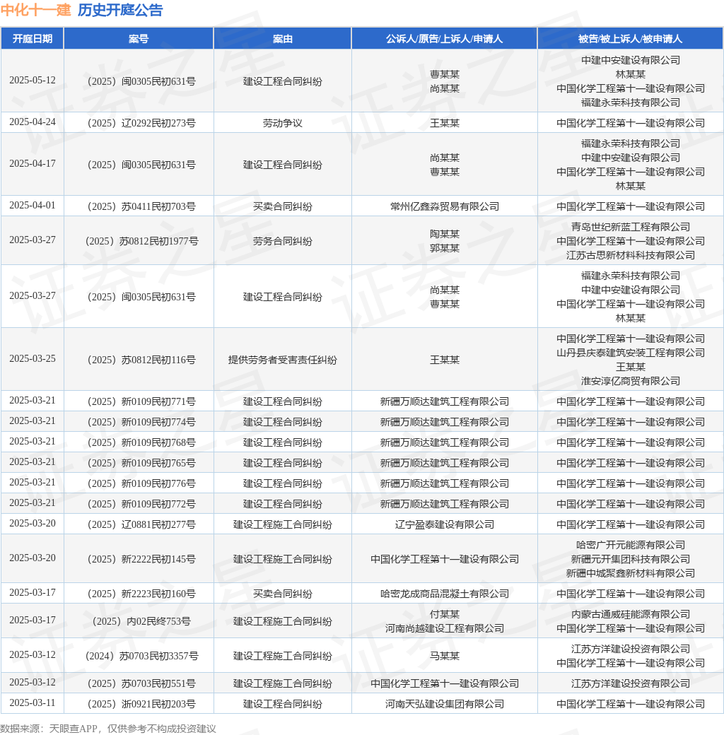证券之星消息,根据天眼查APP显示,近日公布了一则中国化学工程第十一建设有限公司作为被告/被上诉人的开庭公告,详细内容如下: