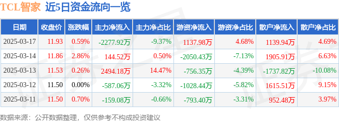 证券之星消息,截至2025年3月17日收盘,TCL智家(002668)报收于11.93元,上涨0.59%,换手率1.88%,成交量20.36万手,成交额2.43亿元。