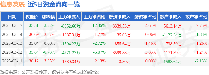 证券之星消息,截至2025年3月17日收盘,信息发展(300469)报收于35.51元,下跌3.22%,换手率8.22%,成交量20.42万手,成交额7.25亿元。