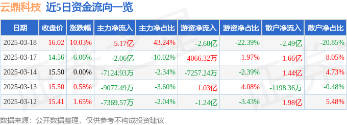 证券之星消息,截至2025年3月18日收盘,云鼎科技(000409)报收于16.02元,上涨10.03%,涨停,换手率17.97%,成交量76.09万手,成交额11.95亿元。