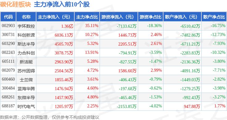 从资金流向上来看,当日碳化硅板块主力资金净流出8.86亿元,游资资金净流入2.17亿元,散户资金净流入6.69亿元。碳化硅板块个股资金流向见下表: