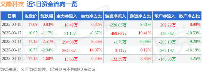 证券之星消息,截至2025年3月18日收盘,艾隆科技(688329)报收于17.09元,上涨0.83%,换手率2.43%,成交量1.32万手,成交额2248.34万元。