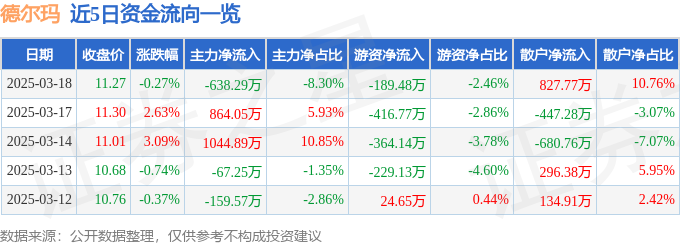 3月18日的资金流向数据方面,主力资金净流出638.29万元,占总成交额8.3%,游资资金净流出189.48万元,占总成交额2.46%,散户资金净流入827.77万元,占总成交额10.76%。