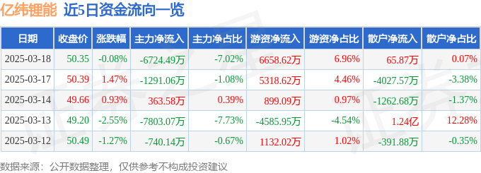 证券之星消息,截至2025年3月18日收盘,亿纬锂能(300014)报收于50.35元,下跌0.08%,换手率1.02%,成交量18.97万手,成交额9.57亿元。