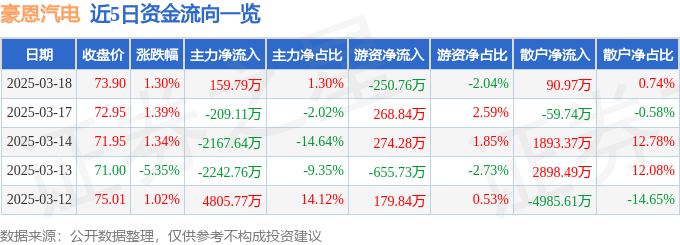 证券之星消息,截至2025年3月18日收盘,豪恩汽电(301488)报收于73.9元,上涨1.3%,换手率7.15%,成交量1.67万手,成交额1.23亿元。