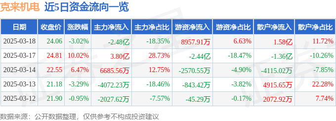 证券之星消息,截至2025年3月18日收盘,克来机电(603960)报收于24.06元,下跌3.02%,换手率20.96%,成交量54.95万手,成交额13.51亿元。
