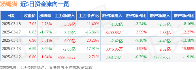 证券之星消息,截至2025年3月18日收盘,汤姆猫(300459)报收于7.02元,上涨2.78%,换手率13.8%,成交量452.91万手,成交额31.46亿元。