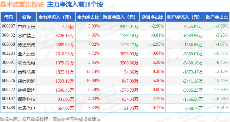 从资金流向上来看,当日毫米波雷达板块主力资金净流出21.36亿元,游资资金净流入3.6亿元,散户资金净流入17.76亿元。毫米波雷达板块个股资金流向见下表: