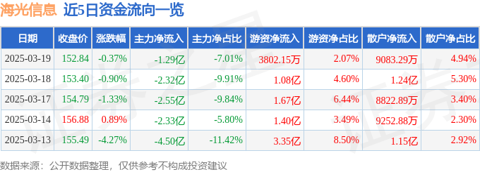 证券之星消息,截至2025年3月19日收盘,海光信息(688041)报收于152.84元,下跌0.37%,换手率1.36%,成交量12.03万手,成交额18.38亿元。