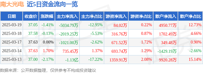 证券之星消息,截至2025年3月19日收盘,南大光电(300346)报收于37.05元,下跌1.41%,换手率1.91%,成交量10.46万手,成交额3.89亿元。