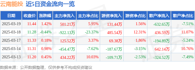 证券之星消息,截至2025年3月19日收盘,云南能投(002053)报收于11.44元,上涨1.42%,换手率0.8%,成交量7.38万手,成交额8426.72万元。