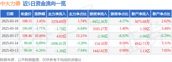 证券之星消息,截至2025年3月19日收盘,中大力德(002896)报收于108.15元,上涨1.45%,换手率12.19%,成交量18.42万手,成交额19.35亿元。