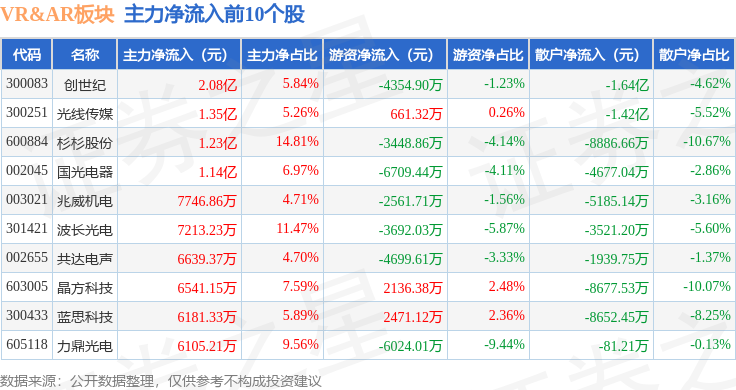 从资金流向上来看,当日VR&AR板块主力资金净流出41.45亿元,游资资金净流入4.72亿元,散户资金净流入36.72亿元。VR&AR板块个股资金流向见下表: