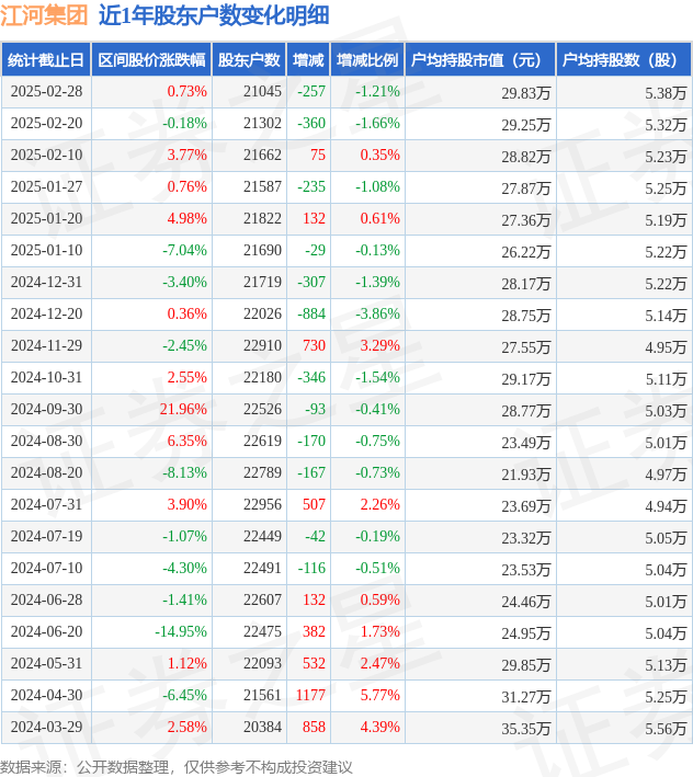 从股价来看,2025年2月20日至2025年2月28日,江河集团区间涨幅为0.73%,在此期间股东户数减少257.0户,减幅为1.21%。