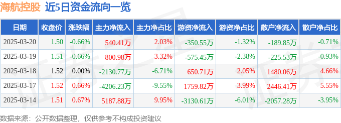 证券之星消息,截至2025年3月20日收盘,海航控股(600221)报收于1.5元,下跌0.66%,换手率0.54%,成交量176.33万手,成交额2.66亿元。