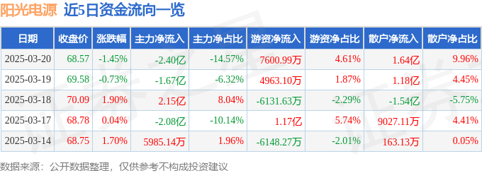 证券之星消息,截至2025年3月20日收盘,阳光电源(300274)报收于68.57元,下跌1.45%,换手率1.5%,成交量23.87万手,成交额16.49亿元。