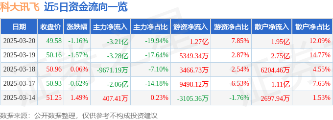 证券之星消息,截至2025年3月20日收盘,科大讯飞(002230)报收于49.58元,下跌1.16%,换手率1.48%,成交量32.39万手,成交额16.12亿元。