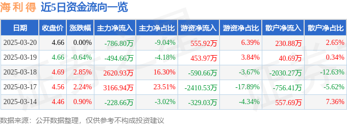 证券之星消息,截至2025年3月20日收盘,海 利 得(002206)报收于4.66元,上涨0.0%,换手率2.04%,成交量18.66万手,成交额8704.68万元。