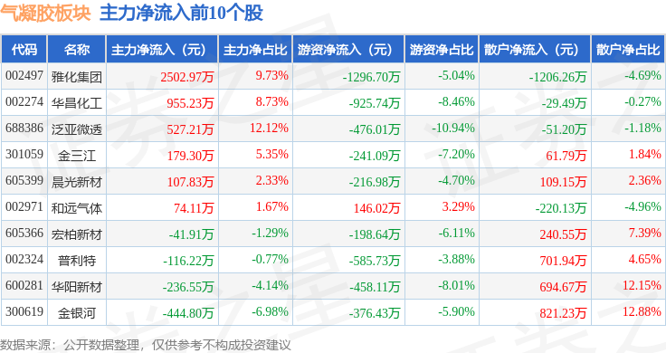 从资金流向上来看,当日气凝胶板块主力资金净流出3.15亿元,游资资金净流入1796.34万元,散户资金净流入2.97亿元。气凝胶板块个股资金流向见下表:
