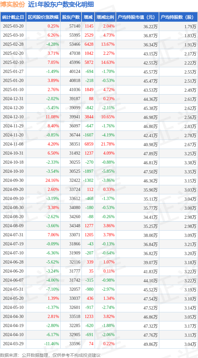 从股价来看,2025年3月10日至2025年3月20日,博实股份区间涨幅为0.25%,在此期间股东户数增加1145.0户,增幅为2.04%。