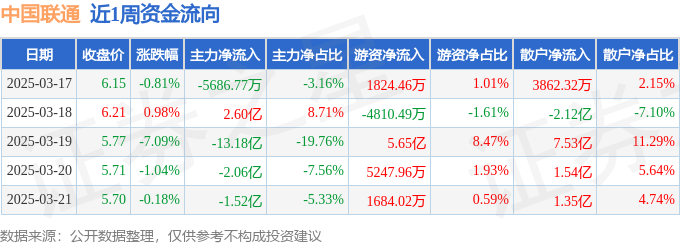 资金流向数据方面,本周中国联通主力资金合计净流出14.73亿元,游资资金合计净流入6.05亿元,散户资金合计净流入8.68亿元。本周资金流向一览见下表: