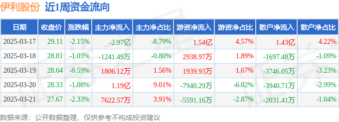 资金流向数据方面,本周伊利股份主力资金合计净流出9611.89万元,游资资金合计净流入6770.61万元,散户资金合计净流入2841.28万元。本周资金流向一览见下表: