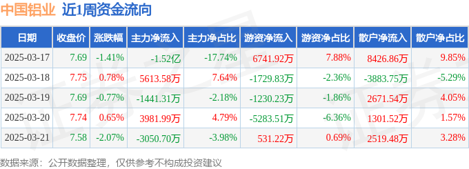 资金流向数据方面,本周中国铝业主力资金合计净流出1.01亿元,游资资金合计净流出970.42万元,散户资金合计净流入1.1亿元。本周资金流向一览见下表: