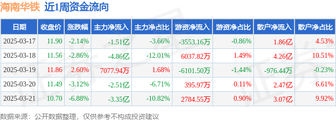 资金流向数据方面,本周海南华铁主力资金合计净流出11.52亿元,游资资金合计净流出436.32万元,散户资金合计净流入11.56亿元。本周资金流向一览见下表:
