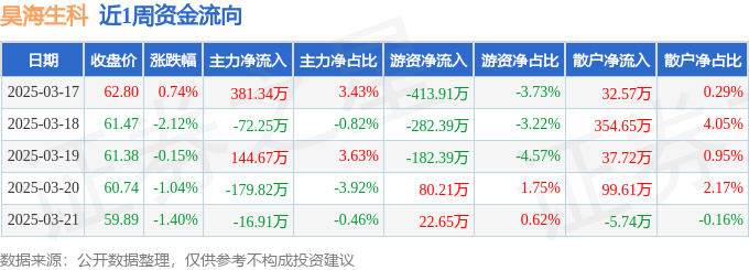 资金流向数据方面,本周昊海生科主力资金合计净流入257.04万元,游资资金合计净流出775.84万元,散户资金合计净流入518.81万元。本周资金流向一览见下表: