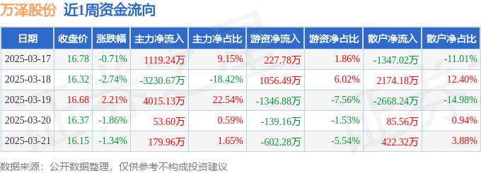 资金流向数据方面,本周万泽股份主力资金合计净流入2137.26万元,游资资金合计净流出804.05万元,散户资金合计净流出1333.21万元。本周资金流向一览见下表: