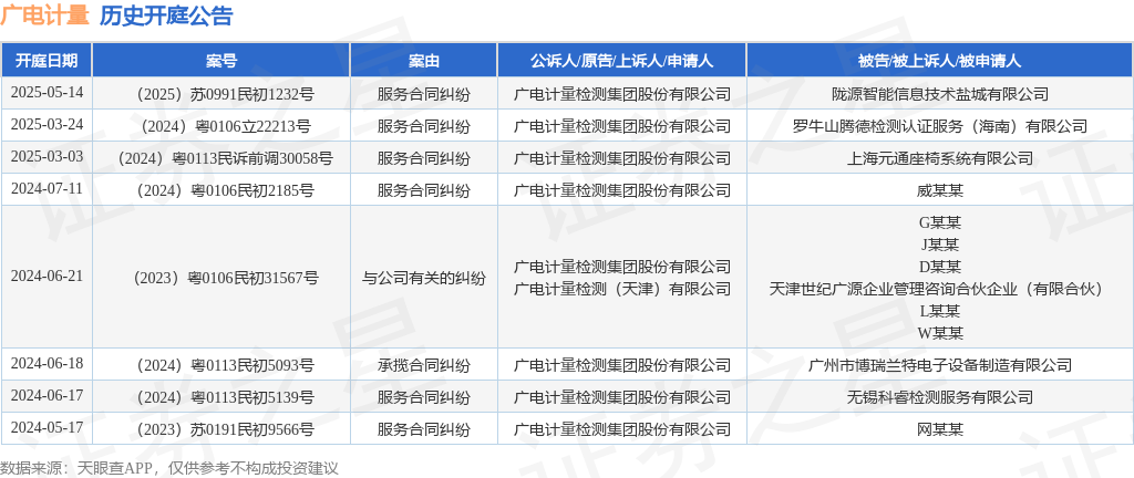 案号:(2024)粤0106立22213号根据统计,近一年内以广电计量检测集团股份有限公司为当事人的历史开庭公告有8则,其中案由为“服务合同纠纷”的公告以6则居首,其次为“与公司有关的纠纷”有1则,“承揽合同纠纷”有1则。历史开庭公告如下: