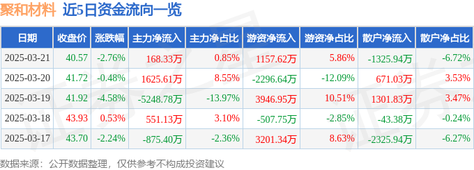 证券之星消息,截至2025年3月21日收盘,聚和材料(688503)报收于40.57元,下跌2.76%,换手率2.66%,成交量4.8万手,成交额1.97亿元。