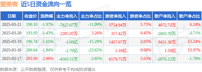 证券之星消息,截至2025年3月21日收盘,爱美客(300896)报收于190.1元,下跌1.97%,换手率1.63%,成交量3.41万手,成交额6.53亿元。