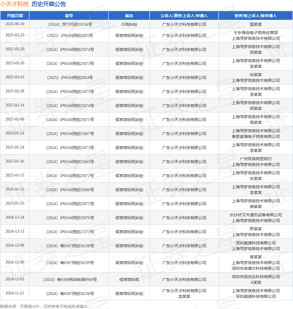 案号:(2025)沪0104民初2825号根据统计,近一年内以广东小天才科技有限公司为当事人的历史开庭公告有45则,其中案由为“侵害商标权纠纷”的公告以31则居首,其次为“侵害外观设计专利权纠纷”有9则,“侵害商标权”有1则。历史开庭公告(前20条)如下: