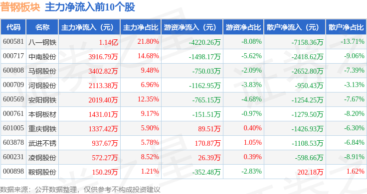 从资金流向上来看,当日普钢板块主力资金净流出9447.65万元,游资资金净流出4868.94万元,散户资金净流入1.43亿元。普钢板块个股资金流向见下表:
