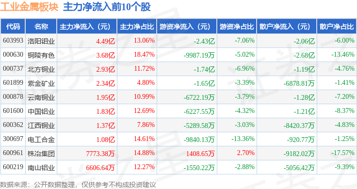 从资金流向上来看,当日工业金属板块主力资金净流入17.45亿元,游资资金净流出11.3亿元,散户资金净流出6.15亿元。工业金属板块个股资金流向见下表:
