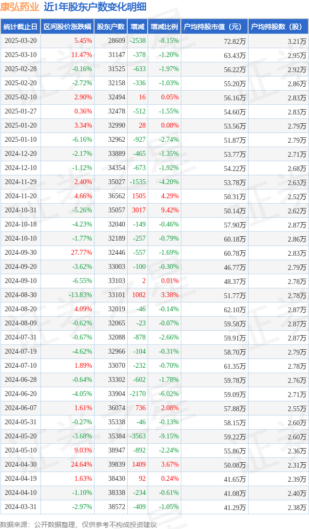 从股价来看,2025年3月10日至2025年3月20日,康弘药业区间涨幅为5.45%,在此期间股东户数减少2538.0户,减幅为8.15%。
