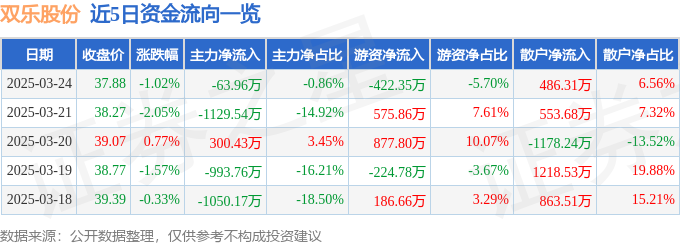 证券之星消息,截至2025年3月24日收盘,双乐股份(301036)报收于37.88元,下跌1.02%,换手率2.81%,成交量1.98万手,成交额7415.04万元。