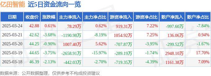 证券之星消息,截至2025年3月24日收盘,亿田智能(300911)报收于42.88元,上涨0.61%,换手率2.28%,成交量2.95万手,成交额1.27亿元。