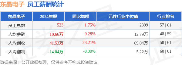 证券之星消息,3月25日东晶电子公布2024年年报,当年营收2.17亿元,同比增25.37%;净利润为-7345.34万元,同比减10.3%。根据财报数据披露,当年公司员工总数523人,同比增1.75%;人均薪酬10.66万元,同比增9.28%;人均创收41.53万元,同比增23.21%;公司员工薪酬统计见下表:
