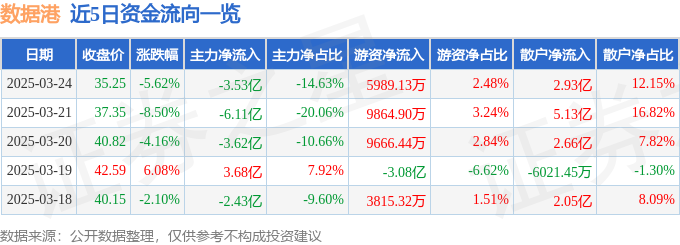 证券之星消息,截至2025年3月24日收盘,数据港(603881)报收于35.25元,下跌5.62%,换手率11.35%,成交量67.92万手,成交额24.15亿元。