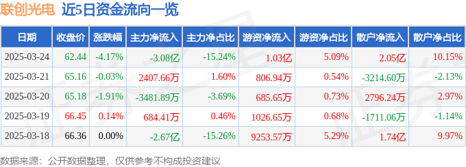 证券之星消息,截至2025年3月24日收盘,联创光电(600363)报收于62.44元,下跌4.17%,换手率7.21%,成交量32.71万手,成交额20.22亿元。