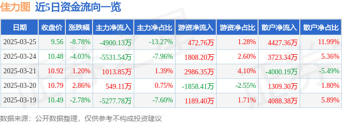 3月25日的资金流向数据方面,主力资金净流出4900.13万元,占总成交额13.27%,游资资金净流入472.76万元,占总成交额1.28%,散户资金净流入4427.36万元,占总成交额11.99%。