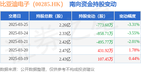 证券之星消息,3月25日南向资金减持773.6万股比亚迪电子(00285.HK)。近5个交易日中,获南向资金减持的有3天,累计净减持1588.72万股。近20个交易日中,获南向资金减持的有14天,累计净减持5298.92万股。截至目前,南向资金持有比亚迪电子(00285.HK)2.26亿股,占公司已发行普通股的10.01%。