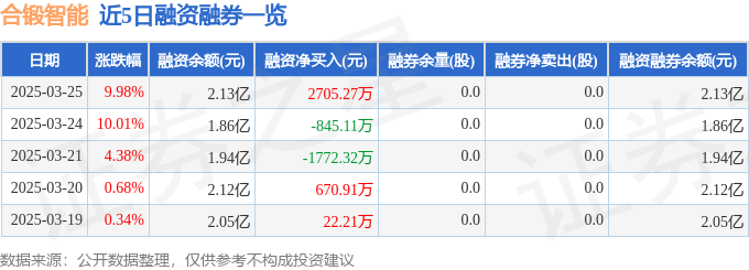 证券之星消息,截至2025年3月25日收盘,合锻智能(603011)报收于11.24元,上涨9.98%,已连续涨停2天,换手率3.36%,成交量16.59万手,成交额1.87亿元。