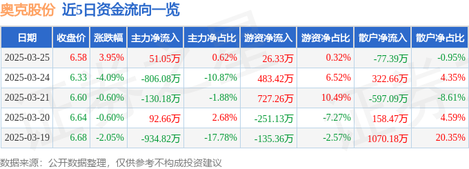证券之星消息,截至2025年3月25日收盘,奥克股份(300082)报收于6.58元,上涨3.95%,换手率1.85%,成交量12.53万手,成交额8183.64万元。