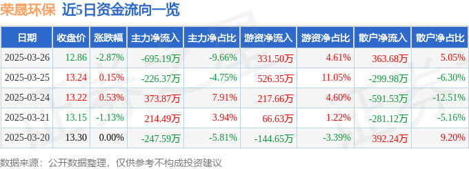 证券之星消息,截至2025年3月26日收盘,荣晟环保(603165)报收于12.86元,下跌2.87%,换手率2.05%,成交量5.6万手,成交额7196.9万元。