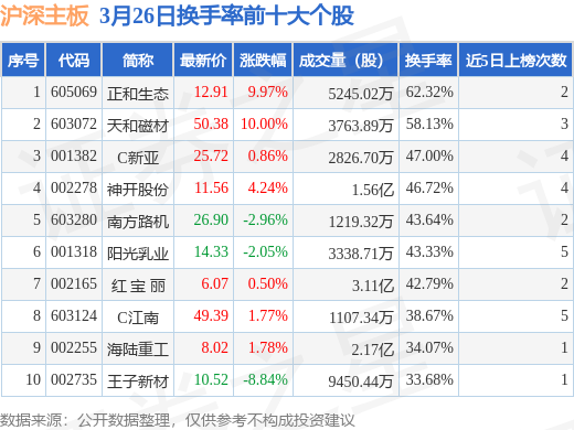 当日沪深主板换手率前10大个股中7只个股收涨,平均涨幅4.16%,其中正和生态(605069)以换手率62.32%排第一,8只个股近5个交易日中多次上榜。