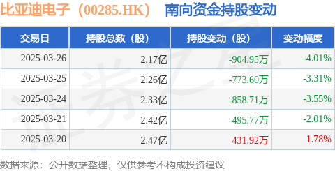 证券之星消息,3月26日南向资金减持904.95万股比亚迪电子(00285.HK)。近5个交易日中,获南向资金减持的有4天,累计净减持2601.12万股。近20个交易日中,获南向资金减持的有14天,累计净减持6067.97万股。截至目前,南向资金持有比亚迪电子(00285.HK)2.17亿股,占公司已发行普通股的9.6%。
